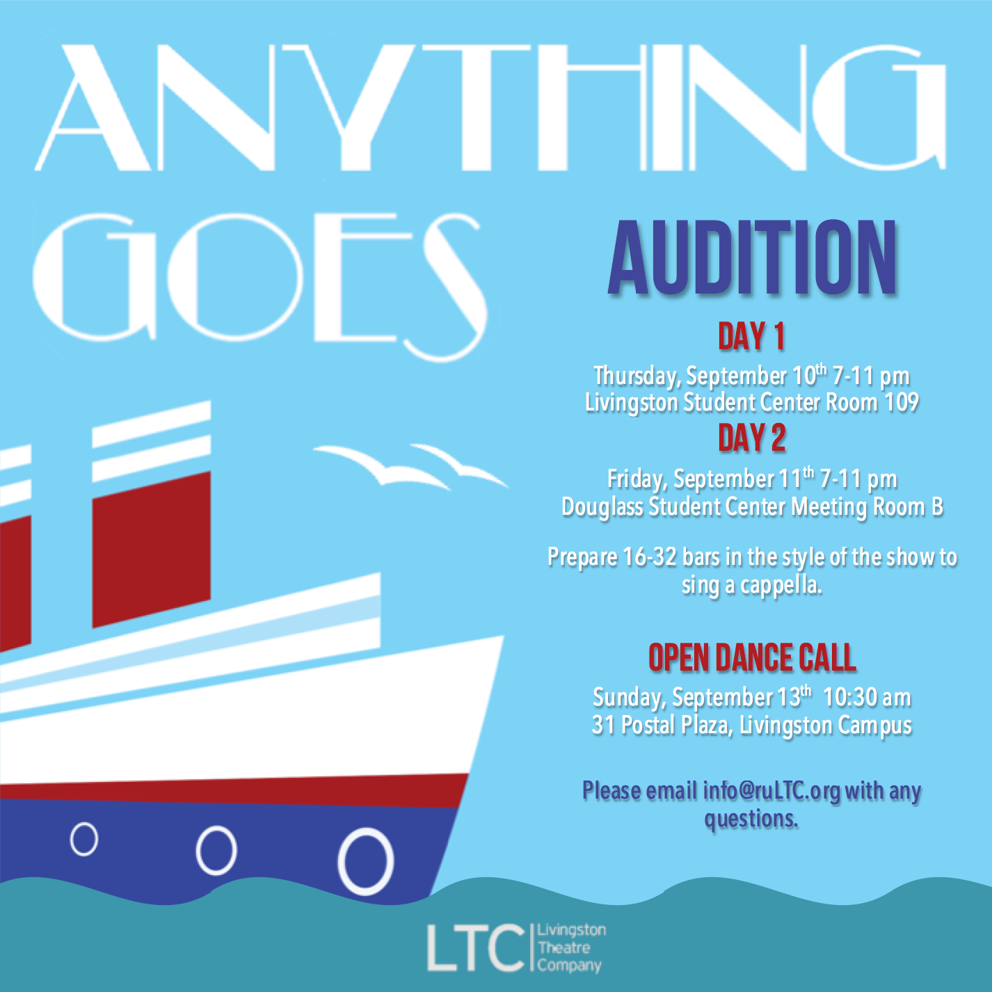 Auditions for Anything Goes will be held this Thursday, September 10 from 7-11 pm in Room 109 - Livingston Student Center - and Friday, September 11 from 7-11 pm in Meeting Room B - Douglass Student Center. Check out our Auditions page for more information on how an audition with LTC works! We hope to see you there!
