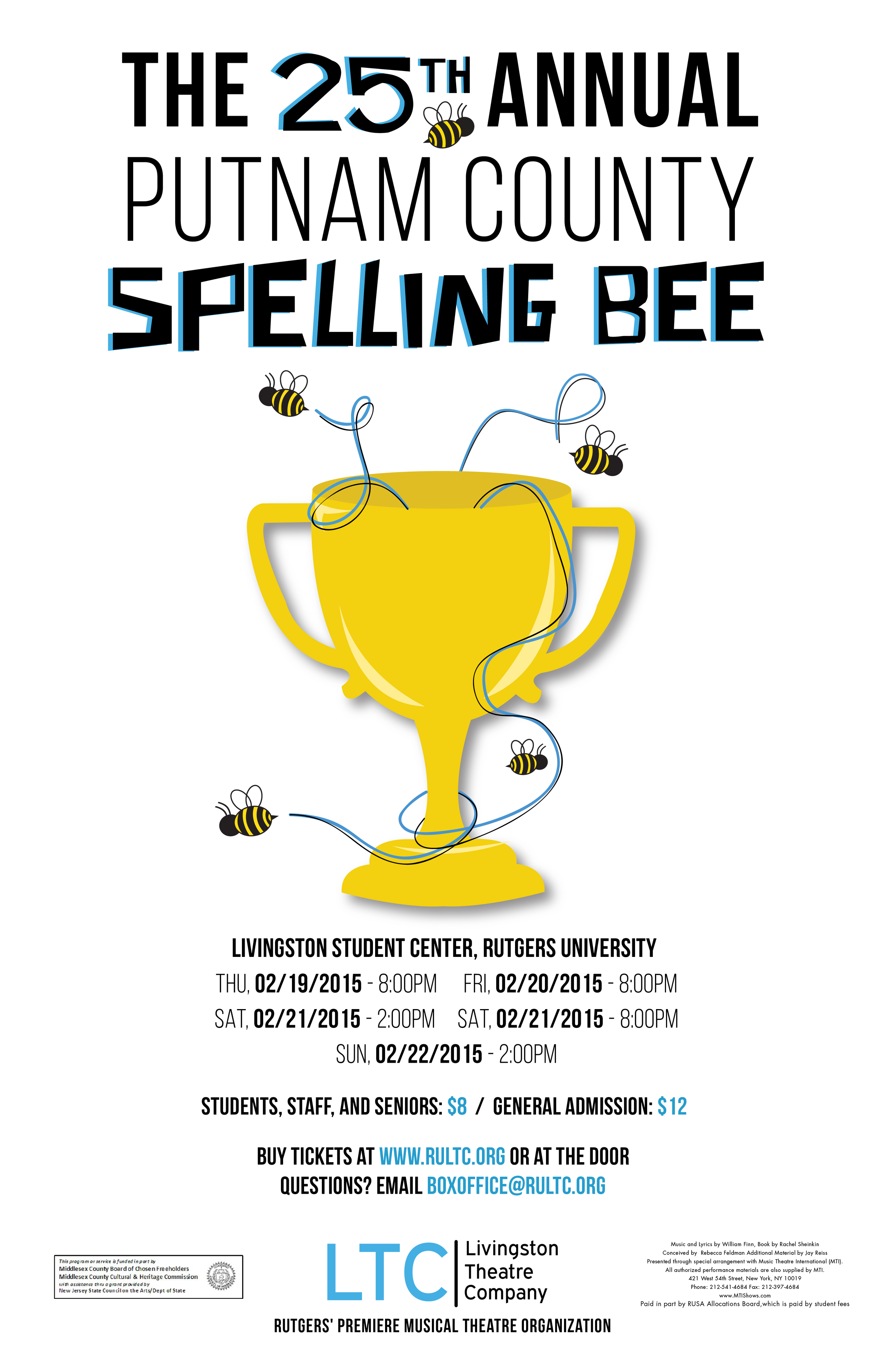 The 25th Annual Putnam County Spelling Bee is a musical comedy with music and lyrics by William Finn, book by Rachel Sheinkin and additional material by Jay Reiss. The show centers on a fictional spelling bee set in Putnam Valley Middle School. Six quirky adolescents compete in the bee, run by three equally unorthodox grown-ups. Spelling Bee is known for audience participation, as members of the audience join the actors on stage as participants in the bee.
