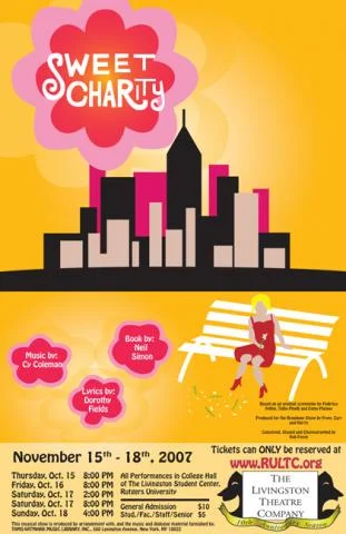 From perhaps one of the greatest playwrights of the 20th century, Neil Simon, comes the charming and unlucky story of Charity Hope Valentine. And with a name like that, what else could her story be? This fun-loving, fun-living show is sure to entertain you with its show-stopping dance numbers and its jazzy dialogue. The music by Cy Coleman is the stuff of classic. With hits like “Big Spender,” “Something Better than This,” and “If They Could See Me Now,” Sweet Charity is sure to put a smile on your face and a tap in your step. This show will be the final show performed in the current set up of College Hall at the Livingston Student Center. Join us as we celebrate it with our one woman “brass band”: Charity.